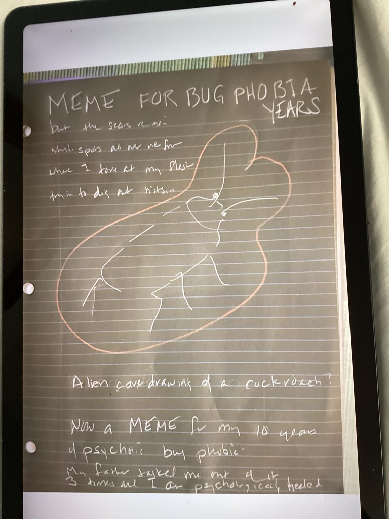 in Florida I went into a sick, serious neurological stress phase which started with having an image of poking my finger up people’s asses in the supermarket line. Nit sound funny but it wasn’t. I said to my husband please kill me. Just kill me. It was just over. Next, as follows, insane psychotic bug phobia: