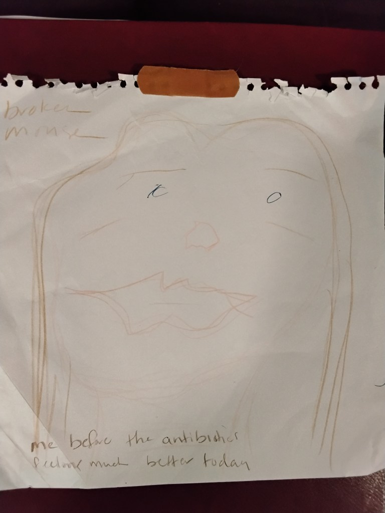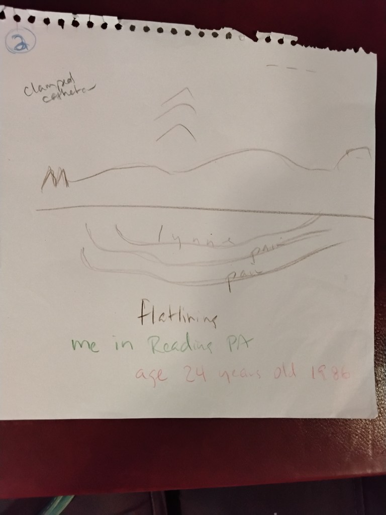 this is a drawing from the ALF in Reading about a year ago reflecting my experience at the Reading Hospital a stones throw away but decades ago in times. It’s hard to read the writing but its about the clamped catheter (clamped on my clitoris in other words) and the horrible pain ebbing away my life.